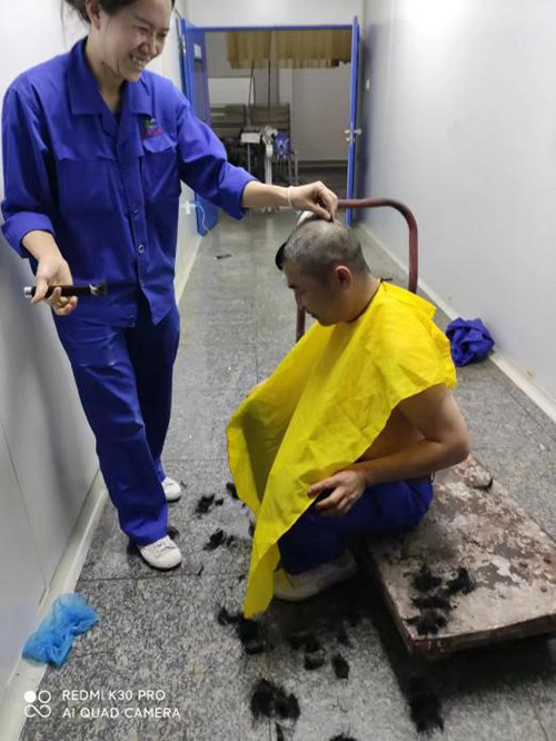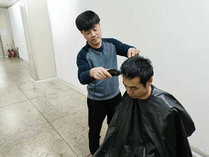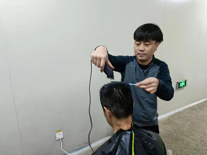 這一幕發(fā)生在11月21日公司中提車間。疫情阻擊戰(zhàn)開(kāi)始至今已將近一月,為做好抗疫情保生產(chǎn)工作,公司采取了封閉式管理。500多名干部員工駐廠,堅(jiān)守崗位,加班加點(diǎn),維護(hù)了廠內(nèi)良好的生產(chǎn)生活秩序。然而,封控近一個(gè)月,越來(lái)越多的人有了理發(fā)需求。尤其是男職工,一個(gè)個(gè)發(fā)壓眉、鬢過(guò)耳,凌亂而萎靡的樣子,讓人看在眼里急在心里。