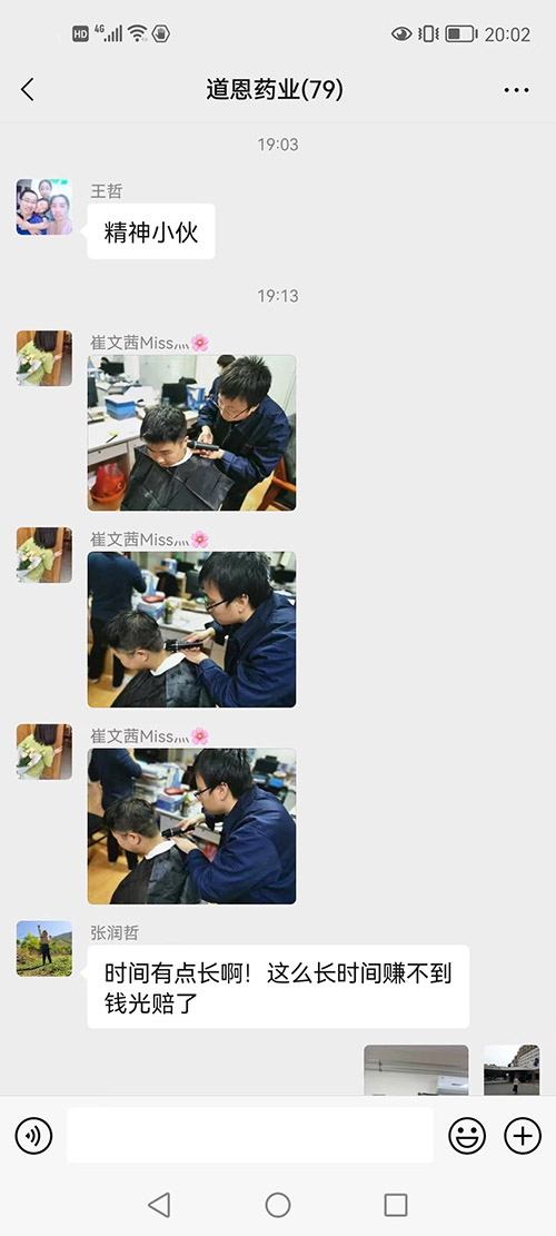 這兩天道恩藥業(yè)工作群里被一段段理發(fā)的視頻和搞笑的評(píng)論刷屏了。視頻里的“理發(fā)師”是道恩藥業(yè)生產(chǎn)總監(jiān)王學(xué)智,他拿著電動(dòng)推子全神貫注為員工理發(fā),每一下都十分認(rèn)真,不放過(guò)任何一個(gè)細(xì)節(jié);被理發(fā)的“頹廢少年”秒變“精神小伙”;圍觀群眾打趣到:“服務(wù)這么長(zhǎng)時(shí)間卻賺不到錢,光賠了。”理發(fā)現(xiàn)場(chǎng)的氣氛十分融洽,隔著屏幕都能讓我們感受到那份歡快。