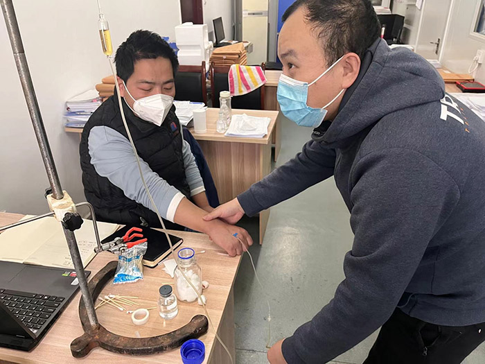 “哪位同事會輸液?”一聲令下孫江挺身而出來到三廠給王潤偉輸液扎針。由于第二天孫江工作需要脫不開身,眼看好轉(zhuǎn)的王潤偉沒有人給輸液了,這可怎么辦?我跟王潤偉說我扎過兔子,我敢下手,但是不一定能扎進去,你敢嗎?他笑笑說:“你在我這練練就會了。”我拿起輸液器嘗試了兩次仍沒有扎進去,緊張的我出了一身汗,抬頭看看王潤偉我十分抱歉的說:“真不好意思,兩針都沒進去。”他毫不在意的笑著說:“沒事多扎幾針就行了。”但是在強大的心理壓力下,我不敢再次嘗試。張總又一次緊急尋找能輸液扎針的人,最后找到了只扎過兩次針的道恩化驗室微生物組組長呂文杰。呂文杰看看王潤偉的手說:“你這確實不好扎。”兩針下去又沒有成功。扎過針的人都知道越是扎不中血管疼痛就會越劇烈,王潤偉沒有任何責(zé)備,一直保持著微笑,說到:“咱們換只手扎吧。”又一針下去終于成功了。呂文杰如釋重負(fù),擦了擦頭上的汗對王潤偉豎起了大拇指。