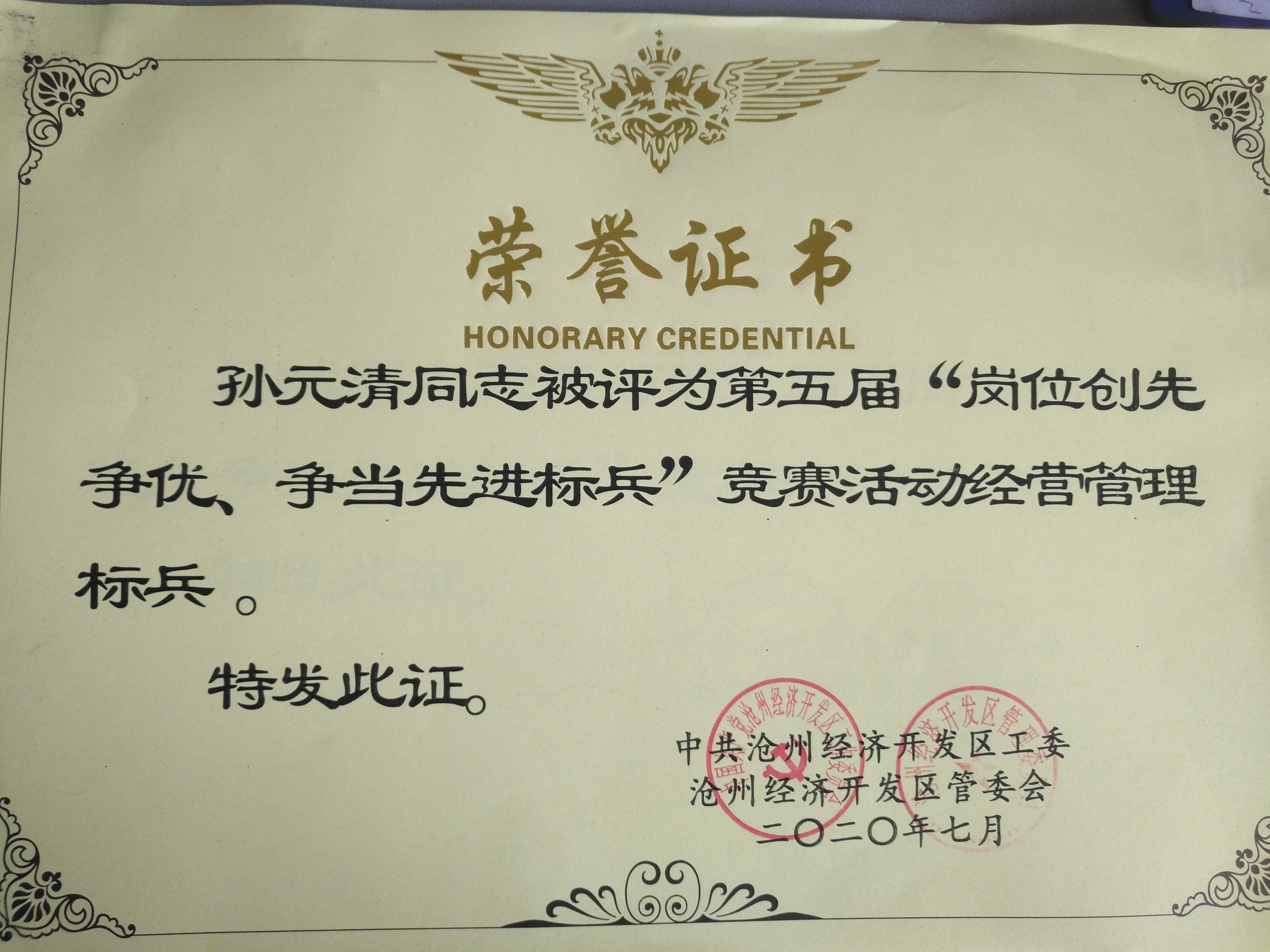 近日,滄州開發(fā)區(qū)企業(yè)委員會開展第五屆“崗位創(chuàng)先爭優(yōu)、爭當(dāng)先進(jìn)標(biāo)兵”競賽活動,公司總經(jīng)理孫元清被授予經(jīng)營管理標(biāo)兵、綜合部部長呂斌被授予安全標(biāo)兵榮譽(yù)稱號、設(shè)備部部長劉植梅被授予技術(shù)創(chuàng)新標(biāo)兵榮譽(yù)稱號、原料藥車間馬鵬舉、輸液二車間丁傳彥被授予生產(chǎn)標(biāo)兵榮譽(yù)稱號。此次評選表彰工作圍繞提高管理水平、保證安全生產(chǎn)、增加經(jīng)濟(jì)效益、促進(jìn)技術(shù)進(jìn)步,以創(chuàng)一流管理、創(chuàng)優(yōu)秀團(tuán)隊(duì)、創(chuàng)最佳效益為目標(biāo),立足崗位創(chuàng)先爭優(yōu),開展?fàn)幃?dāng)標(biāo)兵競賽,引導(dǎo)全體黨員和全體員工以昂揚(yáng)向上的精神風(fēng)貌、更加出色的工作業(yè)績,體現(xiàn)黨組織戰(zhàn)斗力,展示黨員和先進(jìn)員工風(fēng)采,倡導(dǎo)塑造企業(yè)先進(jìn)文化,帶領(lǐng)廣大群眾為企業(yè)和諧快速發(fā)展多做貢獻(xiàn)。