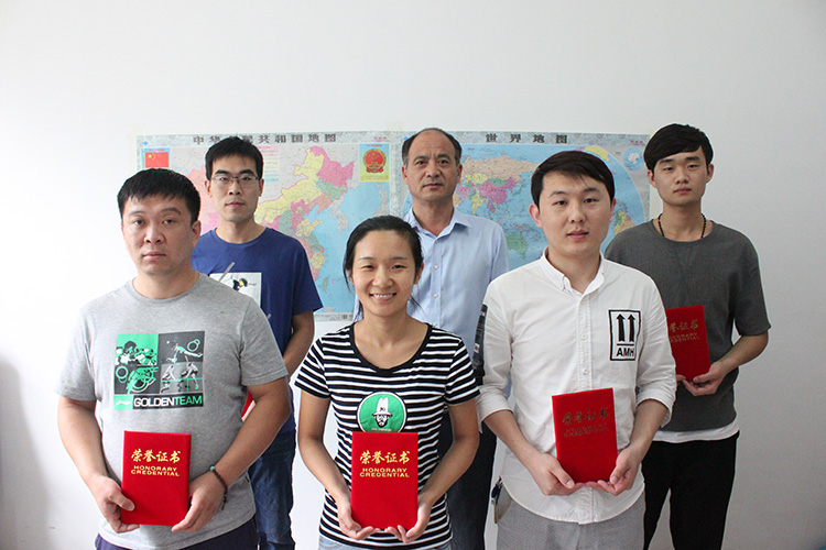 優(yōu)秀員工與領(lǐng)導(dǎo)合影:(后排從左向右)高杰、王顥(常務(wù)副總)、李炳盈;(前排從左向右)王越、李海玲、王帥
