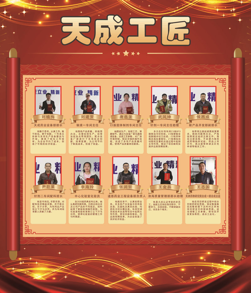 劉植梅:天成藥業(yè)設備部部長,他勤于思考,認真工作,敢于擔當,勇于創(chuàng)新,一年來主持參與多項生產(chǎn)設備整改與升級,提高了崗位工作效率、為企業(yè)節(jié)約了成本,創(chuàng)造了可觀的經(jīng)濟效益。
