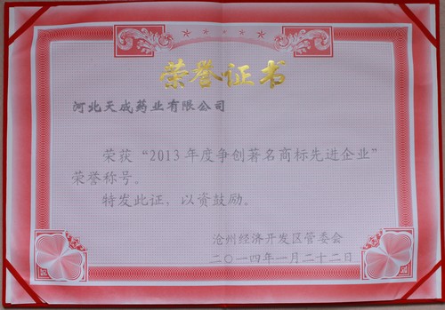 2014年榮獲“2013年度爭創(chuàng)著名商標(biāo)先進(jìn)企業(yè)”榮譽(yù)稱號(hào)
